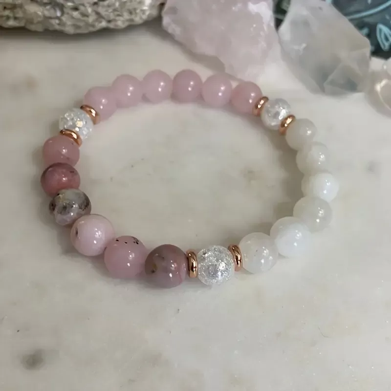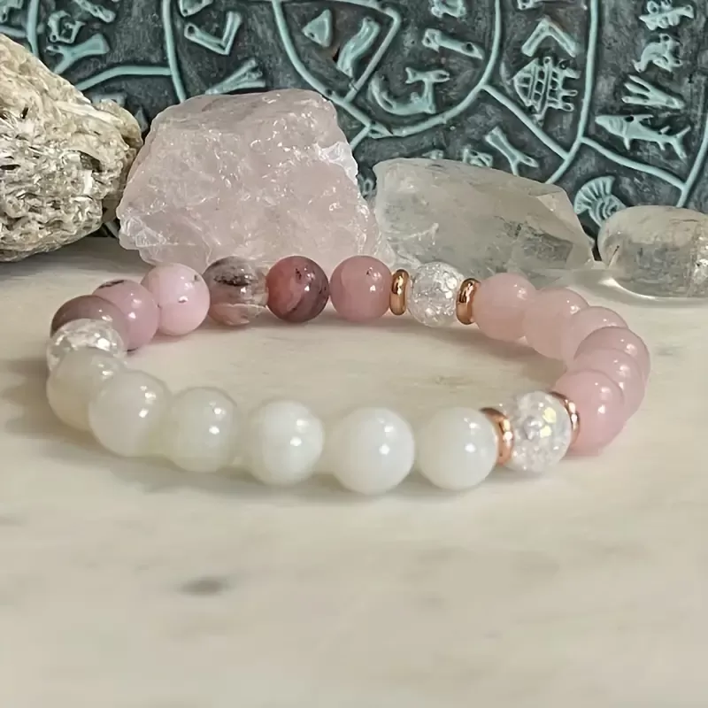 Zapestnica "Zdravljenje Srca" je zasnovana kot nežna energijska podpora za vse, ki si želijo sprostiti čustvene rane preteklosti, očistiti svoje srce starih energij in se pripraviti na sprejemanje prave ljubezni. Izdelana iz roževca, kristala brezpogojne ljubezni, in mesečevega kamna, simbola intuicije in preobrazbe, ta zapestnica deluje kot zdravilni most med preteklimi čustvi in ljubeznijo, ki je v srcu vedno prisotna.