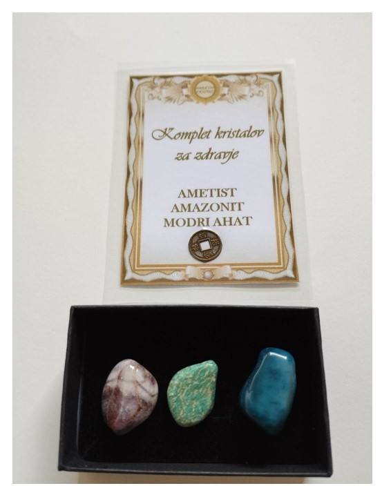 Komplet kristalov prejmete v darilni embalaži. Poleg kompleta pa prejmete tudi kartico seznama kamnov v kateri je AMULET-TALISMAN- Kitajski FENG SHUI KOVANEC