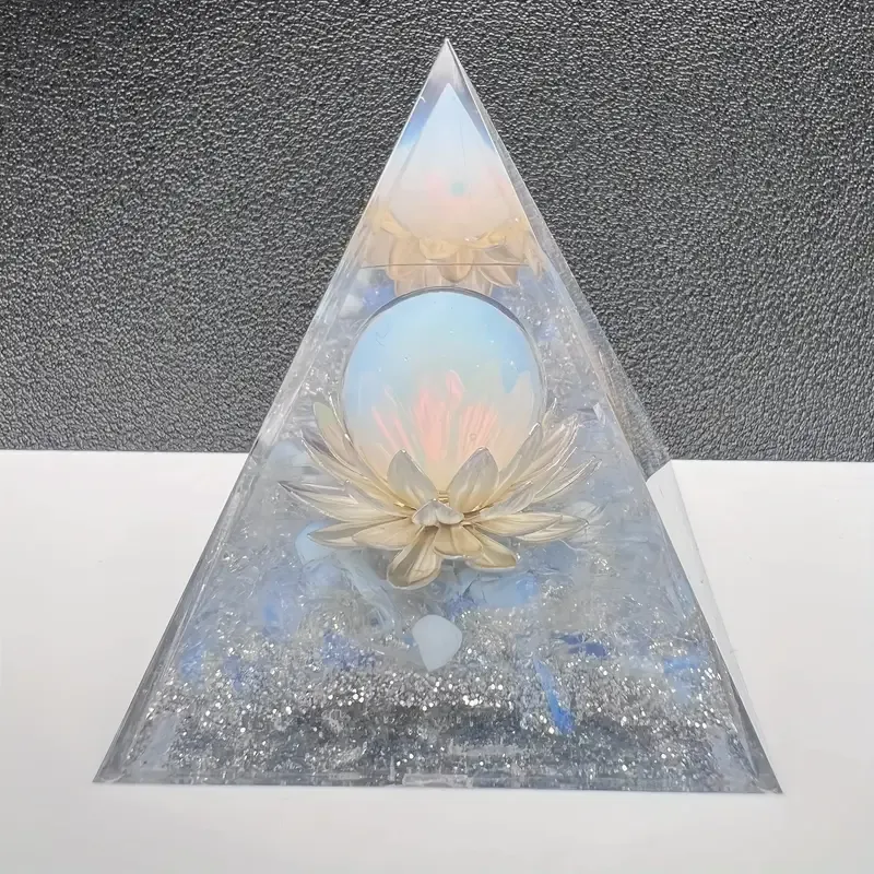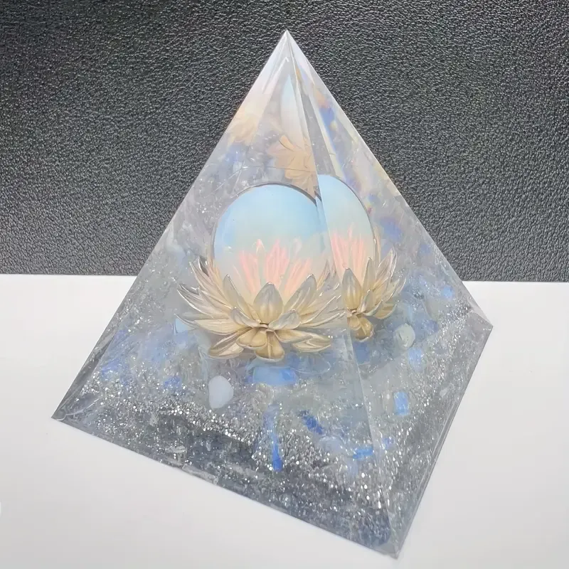 V središču piramide se nahaja simbol lotosa — znak čistosti, preporoda in duhovne rasti. Prosojna in sijoča zasnova piramide deluje nežno in hkrati močno, kar jo naredi odlično za spalnico, meditacijski kotiček, dnevno sobo ali delovno okolje.