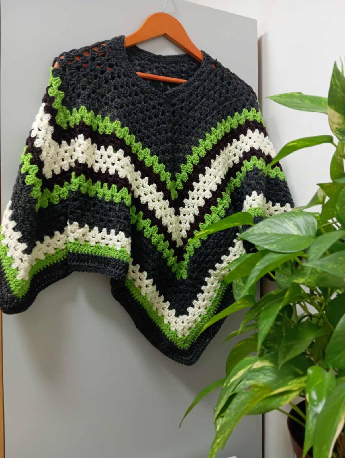 Ta unikatni ročno kvačkani pončo je eleganten in praktičen kos, ki ga lahko nosite skozi vse leto. Sestavljen je iz harmonične kombinacije zelene, bele, rjave in črne barve, ki se zlahka ujema z različnimi stili in kosi v vaši garderobi.