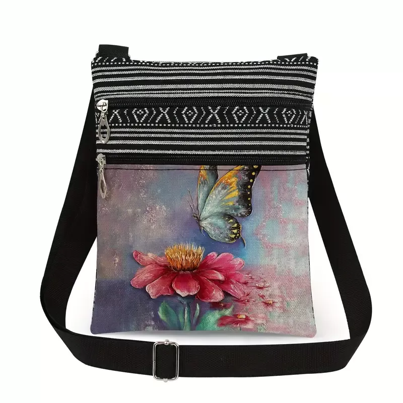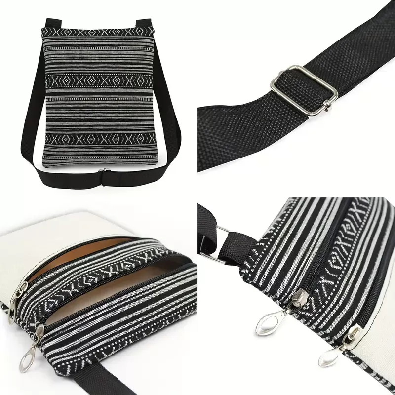 Izdelana je iz kombinacije tkane bombažne ali akrilne tkanine, kar ji daje prijeten občutek in estetski videz. Nastavljiv pas omogoča prilagoditev dolžine, tako da jo lahko nosite čez ramo ali križno, kar je še posebej priročno med sprehodi ali potovanji.