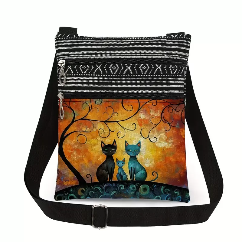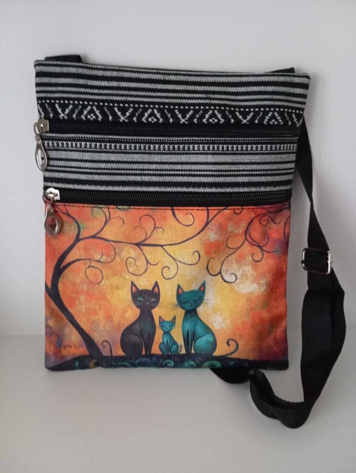 Izdelana je iz kombinacije tkane bombažne ali akrilne tkanine, kar ji daje prijeten občutek in estetski videz. Nastavljiv pas omogoča prilagoditev dolžine, tako da jo lahko nosite čez ramo ali križno, kar je še posebej priročno med sprehodi ali potovanji.