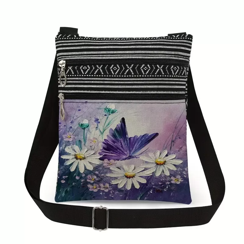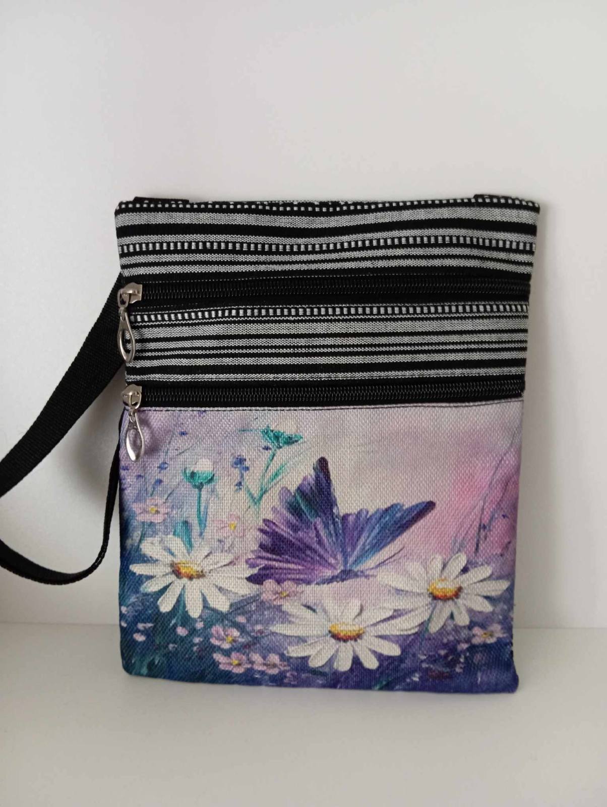 Izdelana je iz kombinacije tkane bombažne ali akrilne tkanine, kar ji daje prijeten občutek in estetski videz. Nastavljiv pas omogoča prilagoditev dolžine, tako da jo lahko nosite čez ramo ali križno, kar je še posebej priročno med sprehodi ali potovanji.